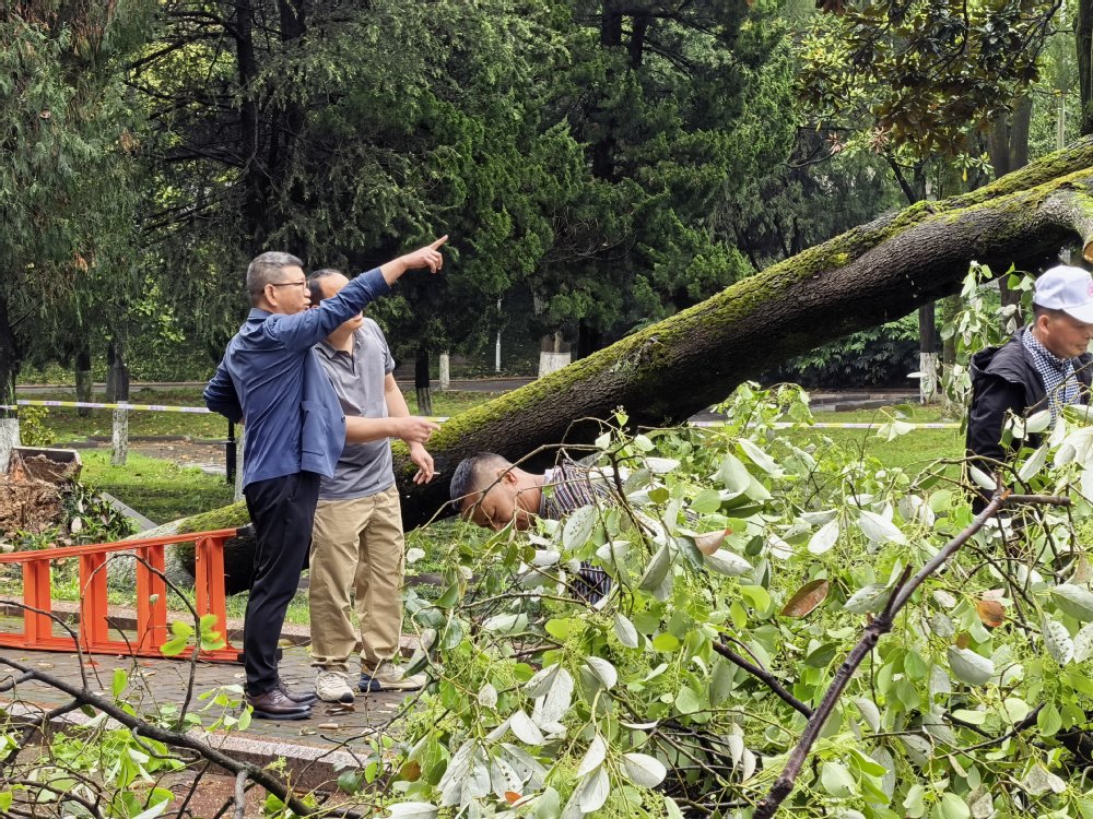 (文、图/刘进安)2026年4月19日晚,贵州大学东、南、西三校区遭遇强风暴雨天气。大风裹挟降雨导致多处行道树倒伏、枝干断裂,不仅横占路面、遮挡视线,且严重阻碍通行,存在极大安全隐患。