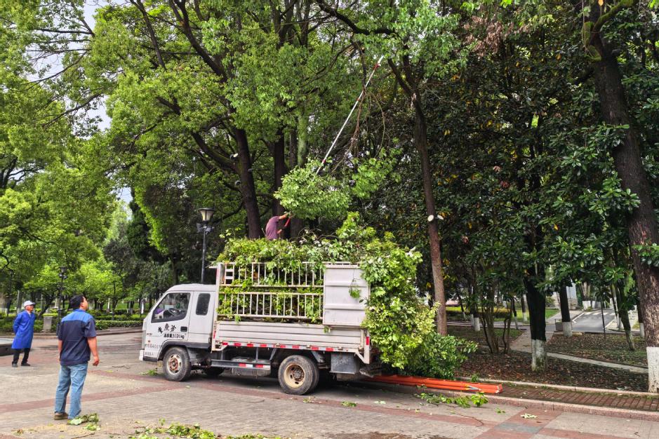 险情就是命令。后勤管理处高度重视,分管领导第一时间到达现场指导工作,园林绿化中心工作人员立即启动恶劣天气应急处置预案,组织抢险队伍携带油锯、警戒标识、清运设备赶赴现场。到达险情点位后,抢险人员迅速设置警戒围挡,疏导过往车辆、行人绕行,排查周边电力线路、拆除树干缠绕射灯电线,严防次生事故发生。